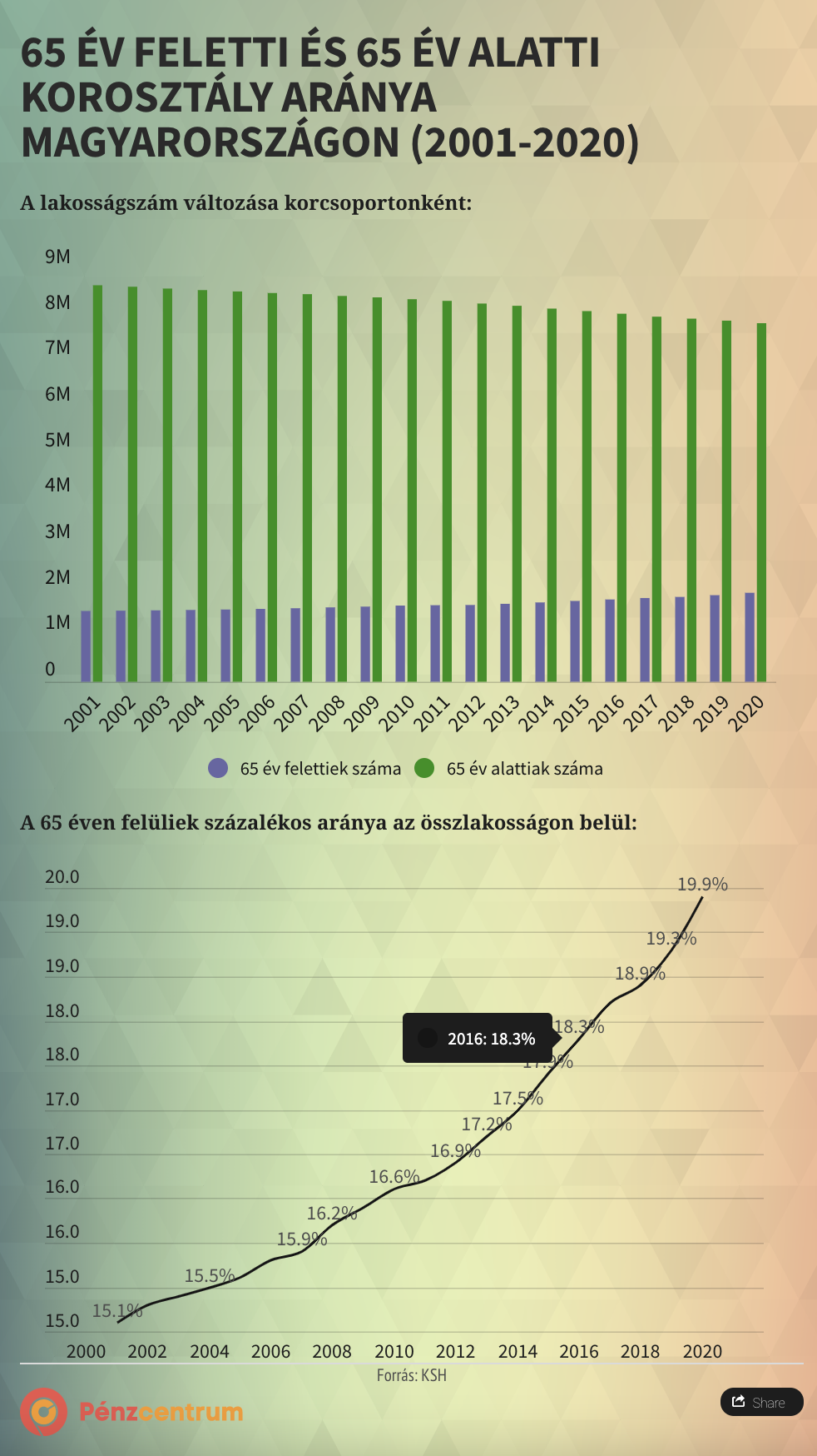 Az senkinek sem újdonság, hogy a demográfiai öregedés problémája Magyarországot is ugyanúgy sújtja, mint az EU legtöbb országát. A Magyarországon élők (9 769 526 fő) közül minden ötödik ember 65 év feletti, arányuk az össztársadalomhoz képest évről évre nő. Míg 2001-ben még csak a lakosság 15,1 százalékát tették ki a 65 éven felüliek, addig 2020-ra ez az arány elérte a 19,9 százalékot. Így 2021-ben már a társdalom több mint egy ötöde lehet 65 év feletti.